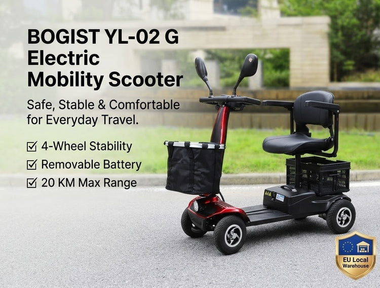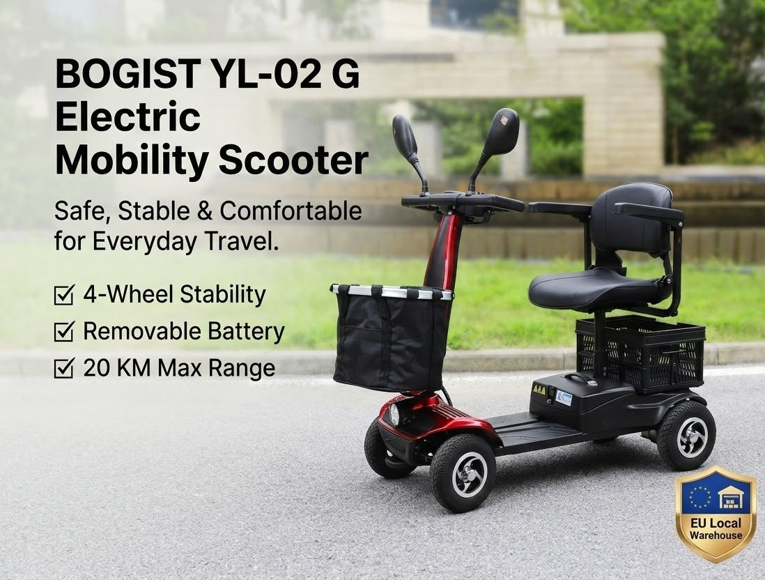 Designed for stability, comfort, and everyday convenience, the BOGIST Sanweipu YL-02G is a compact 4-wheel electric mobility scooter built for safe and reliable daily transportation. Its stable structure and user-friendly controls make it an excellent choice for short trips around neighborhoods, residential communities, parks, and local errands.